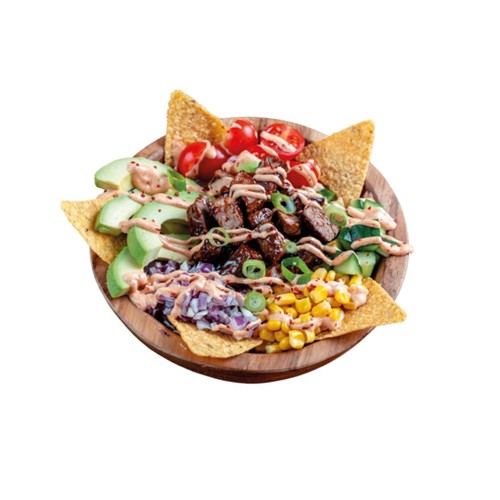 Grass-fed steak, avocado, cherry tomatoes, corn, cucumber, red onions, sriracha mayo, spring onions, chili flakes & nachos