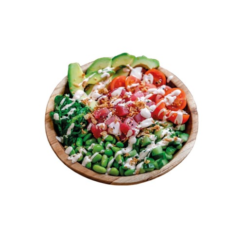 Yellowfin tuna, avocado, edamame beans, seaweed salad, cherry tomatoes, cucumber, sriracha mayo, crunchy seaweed & crispy onions